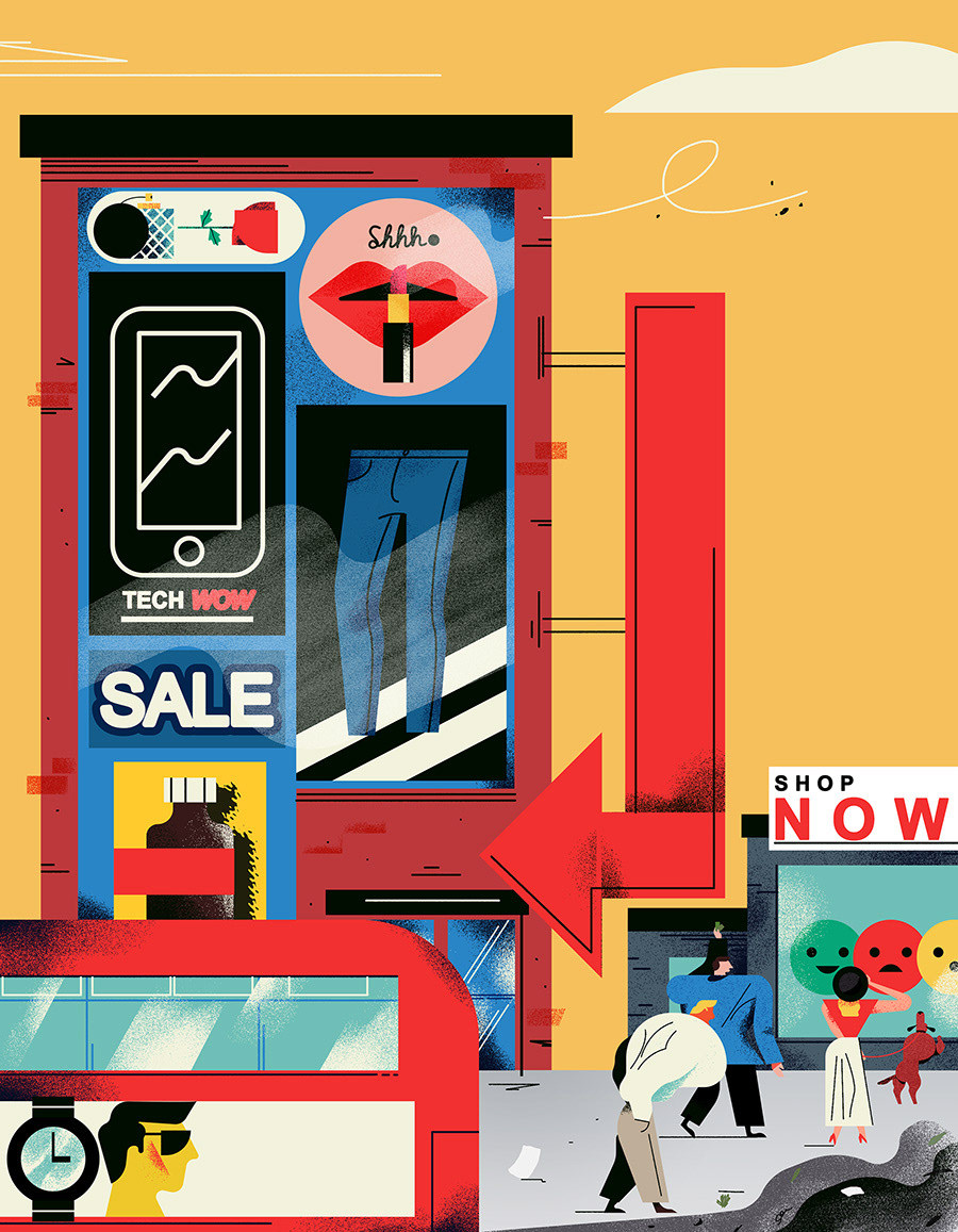 Illustrations for a Dialogue Magazine article which argues people are ruled by emotion and impulse when shopping, rather than rationality and flashy advertising.