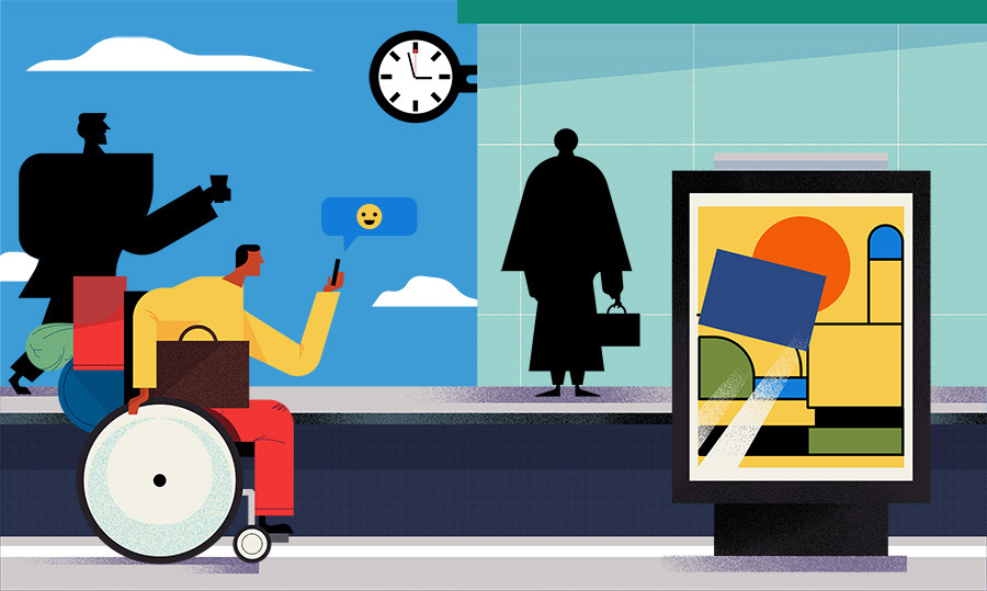 The three main characters can all be seen waiting at train stations. Paraphernalia at the stations like the abstracted poster in the first image allude to the final print poster which was run in the printed editions of the newspaper.